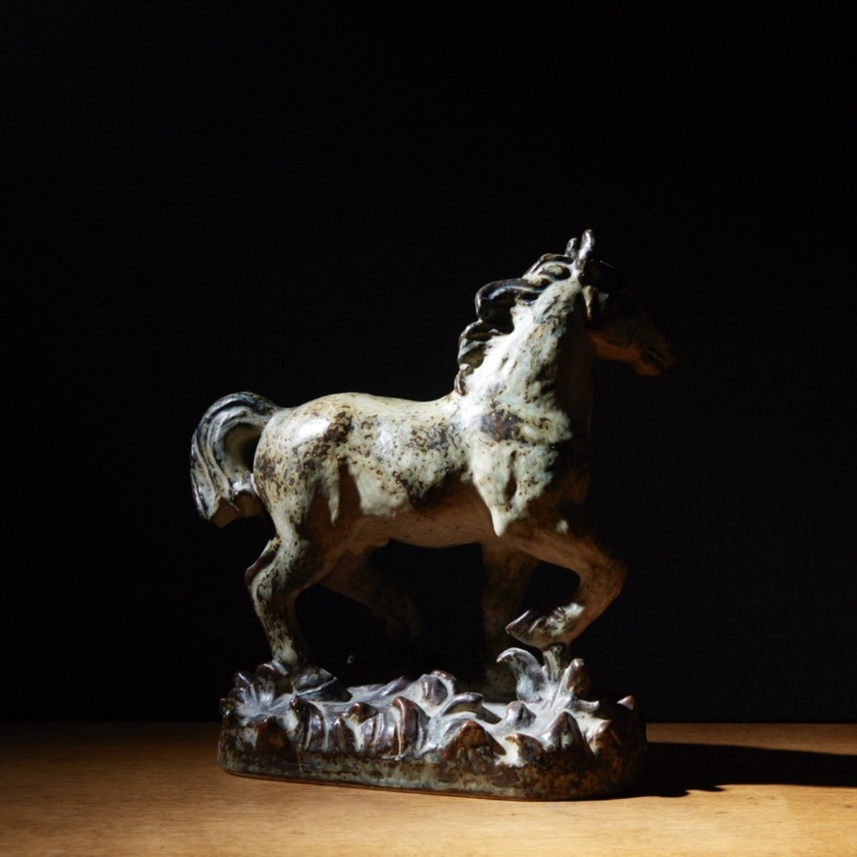 Stoneware figure modelled in the shape of a horse. Decorated with Sung glaze. Signed monoram, 21735. Royal Copenhagen.