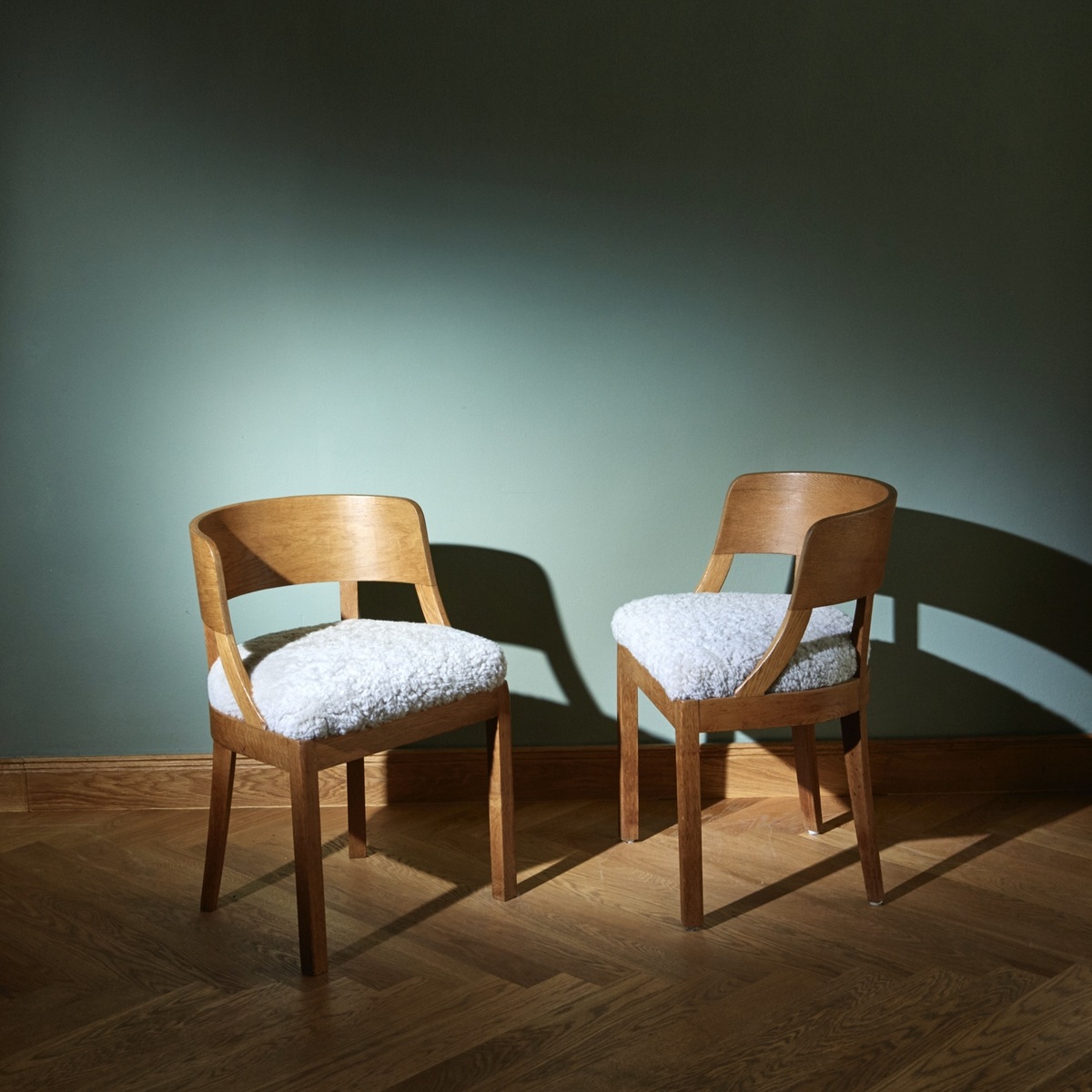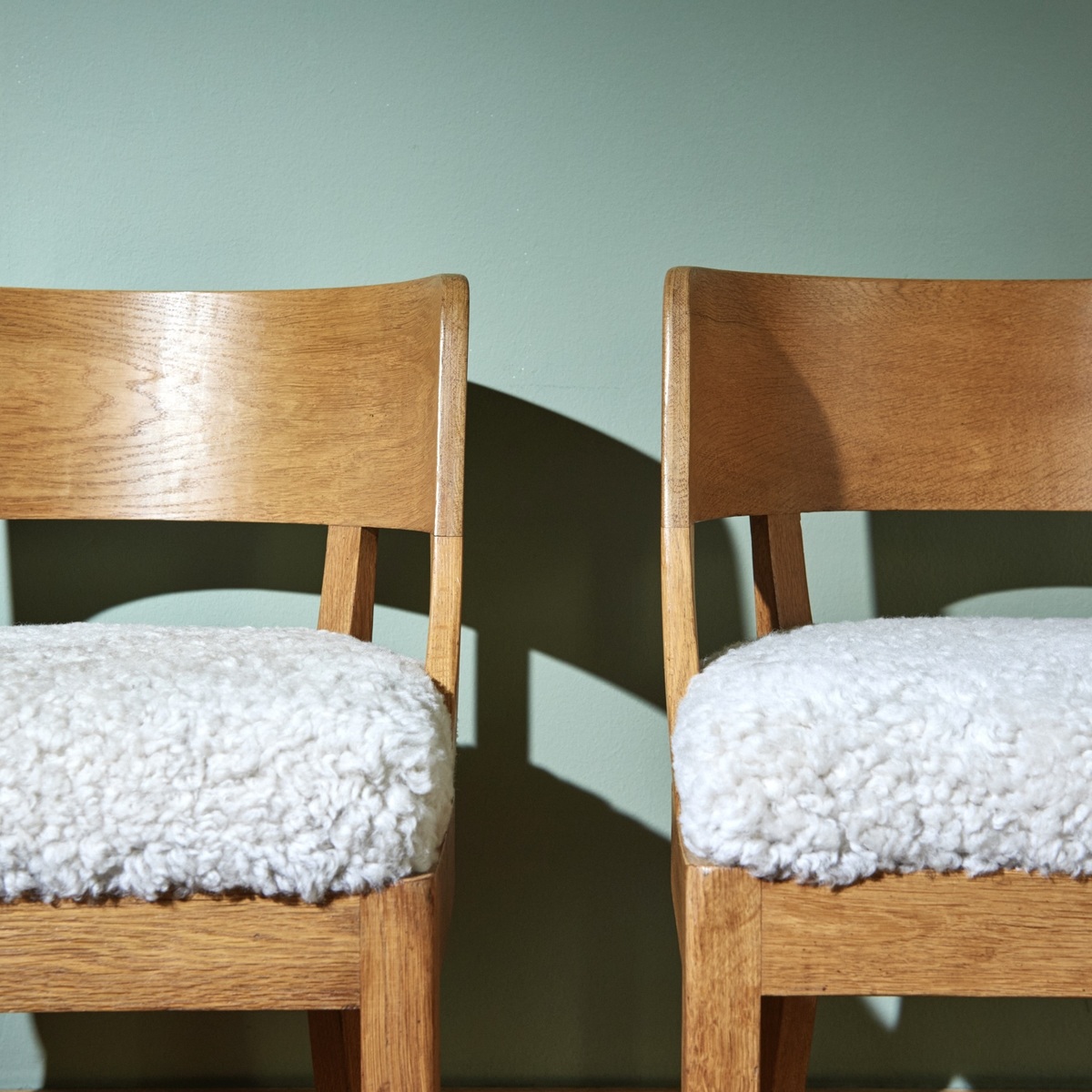 Two chairs with solid oak frames and newly upholstered cushions with lambskin from Merino sheep.